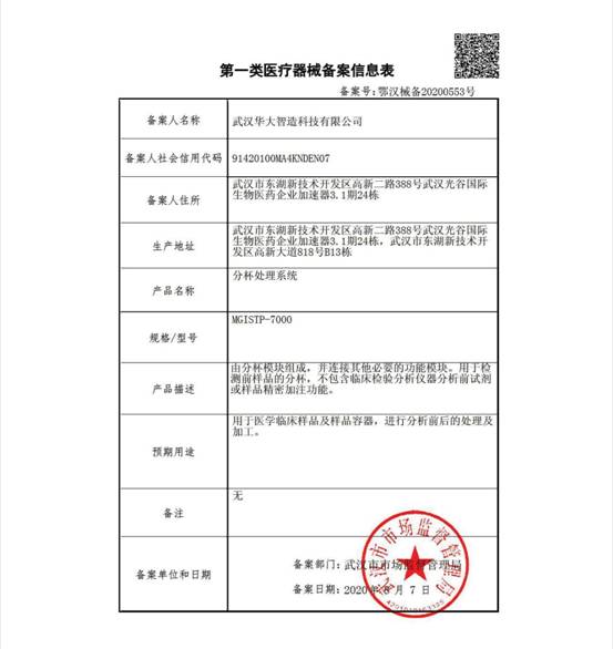 2020年8月7日,深圳华大智造科技股份有限公司(以下简称“华大智造”)最新研发的全自动MGISTp-7000分杯处理系统正式获得国家药品监督管理局NMpA一类