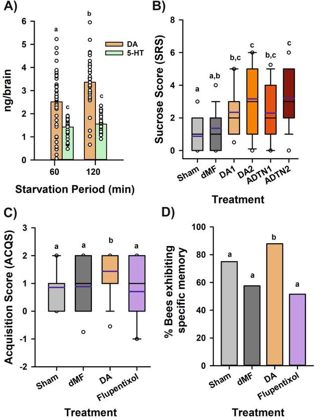 图3蜜蜂多巴胺能信号药理学阻断对采集食物行为的影响