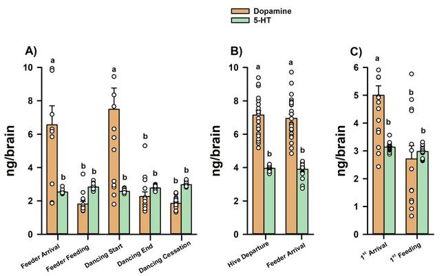 研究一、探究蜜蜂采集后跳舞过程不同阶段其脑部生物胺类神经递质浓度的变化。蜜蜂为满足蜂群和个体的食物需求而进行大量的出巢采食活动,该团队监测蜜蜂定点采食后回巢跳舞不同阶段的行为表现,并利用高效液相色谱-电化学检测器(HpLC-ECD)定量检测不同阶段蜜蜂脑部多巴胺水平,发现在跳舞起始阶段和刚到达饲喂器未取食阶段,蜜蜂脑部多巴胺水平显著升高(图2-A);采集蜂即将离开蜂巢前往饲喂器和到达饲喂器时,蜜蜂脑部多巴胺水平无显著变化(图2-B);采集蜂第一次到达饲喂器时,脑部多巴胺水平显著升高,飞行次数对脑部多巴胺水平没有显著影响(图2-C)。