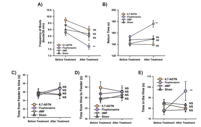 研究二、蜜蜂多巴胺能信号药理学阻断(抑制)对食物采集行为的影响。利用多巴胺拮抗剂(fluphenazine)对多巴胺能信号进行药理学阻断,结果发现蜜蜂采集食物的频率显著降低(图3-A),每次往返采集的总时间显著延长(图3-B),每次往返采集的飞行时间不变(图3-C、D),而在巢内停留时间显著增加(图3-E),表明蜜蜂的食物采集活动受到多巴胺拮抗剂抑制,食物采集欲望下降。利用拮抗剂干扰多巴胺信号传递实验结果进一步证明蜜蜂食物欲望受脑部多巴胺信号调控。