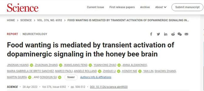 图1《Science》刊发“Food Wanting is Mediated by Transient Activation of Dopaminergic Signaling in the Honey Bee Brain”