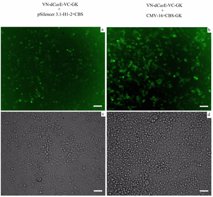 CasE是I-E型CRISpR/Cas系统的核心组件,它绑定特定的茎环区域(即CasE结合位点,CBS)独自加工前体crRNA,形成成熟的crRNA。CasE的保守His20参与催化活性,其突变版本“ΔHis26-TtCse3”使CasE失去催化活性,但仍能与其靶标结合,两个版本在HEK293T亚细胞结构中都均匀表达。利用这些特点,韩春雨团队将split Venus荧光蛋白连接到dCasE(即“ΔHis20)的N和C端,组合成一个实时活细胞RNA追踪工具——VN-dCasE-VC,该工具仅在目标RNA存在时才发出荧光,可提高信噪比。