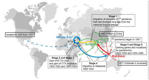 当前霍乱大流行菌株的进化形成过程以及全球迁移示意图霍乱因其高致病性和快速传播能力,而成为全球公共卫生和疾病防控体系最为关注的疾...