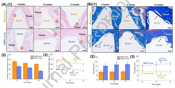 为了进一步研究组织相容性,研究人员在植入两种螺钉后制备了组织切片,并开展HE和Masson染色。图3显示了炎性细胞的数量。尽管两个区域的炎性细胞都随着时间推移而减少,但在手术后第4、8和12周,SMpC螺钉修复部位的炎性细胞明显少于金属螺钉。这些结果表明SMpC螺钉有助于减轻体内的炎症反应。