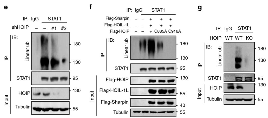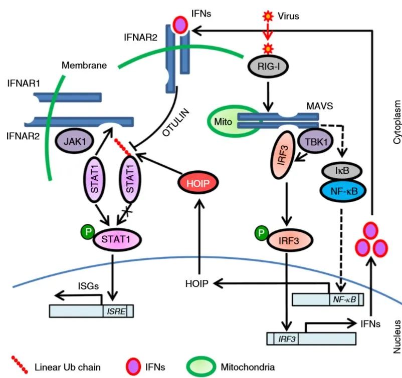 研究者重点关注了信号转导与转录激活因子1(STAT1),那么STAT1是否受线性泛素化调节,进而影响干扰素IFN表达呢?