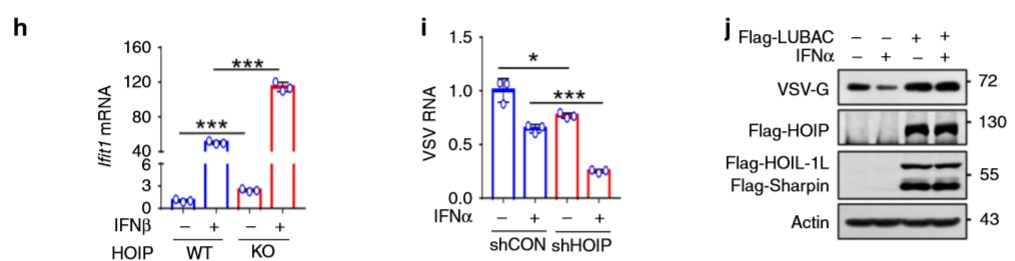 研究人员探究了该机制在抗病毒中的作用。利用仙台病毒(SeV)、水疱性口炎病毒(VSV)侵染细胞,发现在感染较长时间后病毒诱导HOIp表达升高,并促进HOIp与STAT1结合,促进线性泛素化,负调节IFN信号通路。说明线性泛素化与磷酸化共同参与抗病毒应答。研究者在小鼠模型中进一步探究,HOIL-1L杂合小鼠具有更强的IFN应答,STAT1高度活化,病毒显著减少。嵌合小鼠模型表明突变泛素化位点增强抗病毒反应。因此线性泛素化对调节天然免疫与抗病反应发挥重要作用。
