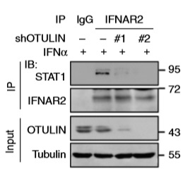 研究人员进而分析STAT1对IFN下游信号的具体调控机制,HOIp敲除或LUBAC过表达对于IFN下游其他蛋白质无影响,仅作用于STAT1通路。通过生物信息学分析结合质谱技术,鉴定出了STAT1的7个赖氨酸泛素化位点,通过氨基酸突变实验证实Lys511、Lys652为线性泛素化位点,能够抑制IFN抗病毒应答。研究者发现HOIp敲除影响胞质STAT1磷酸化水平,线性泛素化可能在STAT1入核之前发挥作用。突变磷酸化位点不影响LUBAC结合更加证明线性泛素化先于磷酸化。IFN诱导信号通路中JAK1结合IFNAR2,招募并磷酸化激活STAT1,线性泛素化可能直接作用于JAK1-STAT1,利用敲除、过表达、突变实验直接证明了线性泛素化抑制JAK1/STAT1结合及IFNAR2招募结合STAT1的过程。说明 Lys511、Lys652的线性泛素化直接阻断了IFNAR2结合。为了探究IFN如何激活STAT1,IFN诱导磷酸化的STAT1没有泛素化,因此推测IFN诱导能够除去STAT1线性泛素化,OTULIN可能与STAT1作用促进该过程。过表达或敲除OTULIN显著影响了线性泛素化,外加IFN可增强OUTLIN与STAT1的结合,因此说明IFN激活STAT1由OTULIN介导。基于之前的结论,过表达或敲除实验也证明OTULIN增强STAT1与IFNAR2结合。
