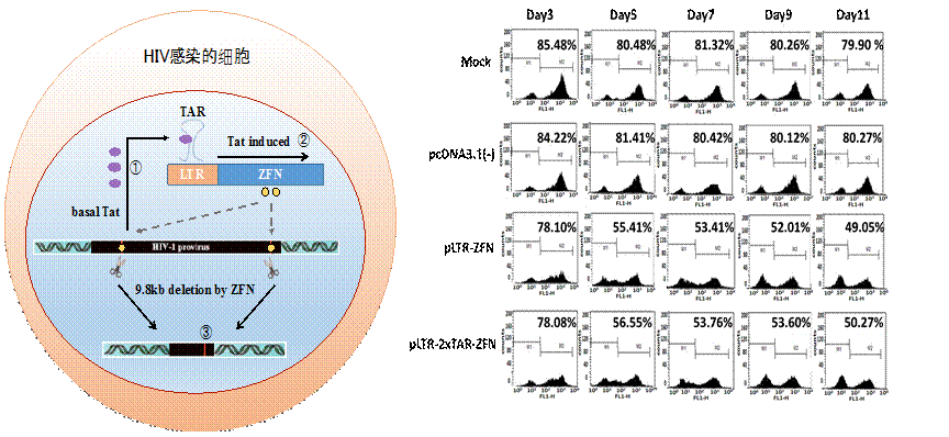 ZFN在HIV-1感染的细胞中依赖Tat诱导9 8kb全长前病毒切除左图为示意图,右图为ZFN表达载体转染HIV病毒感染细胞后流式细胞仪检测切除效率复旦大学生命